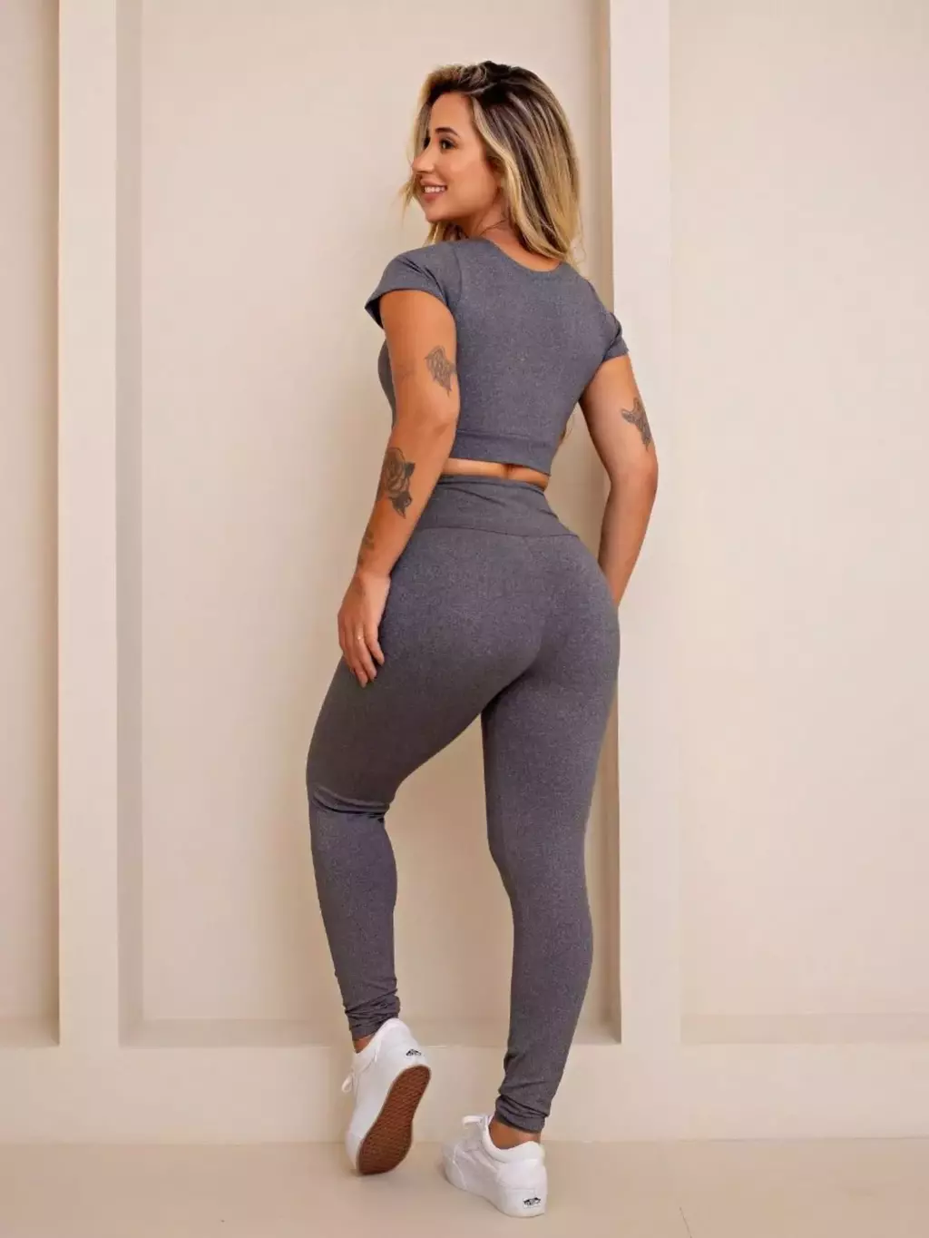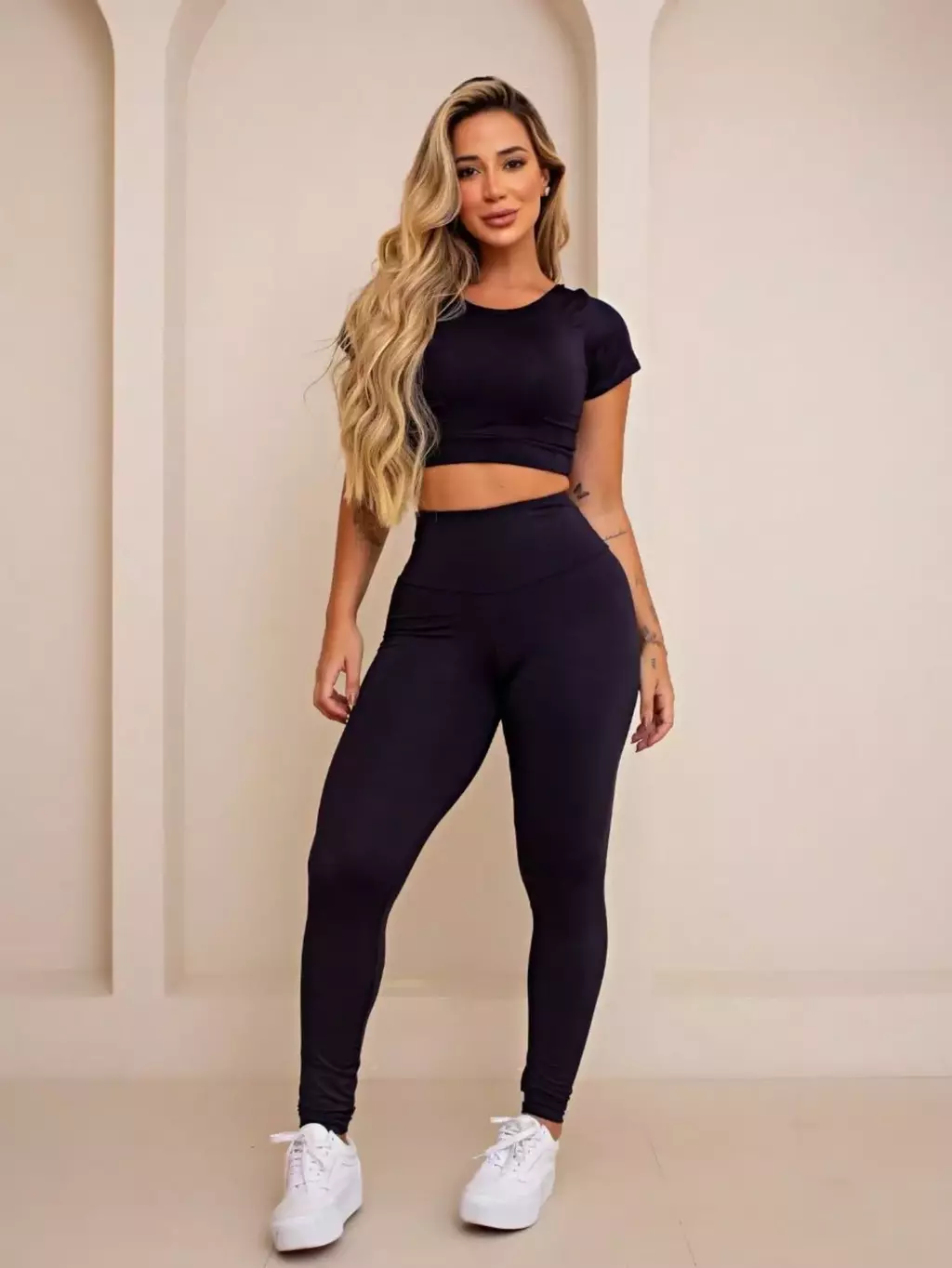 Kit 3 Conjunto Feminino Academia Calça Legging Cintura Alta Compressão Top Cropped Manga Curta Suplex Microfibra Malhar