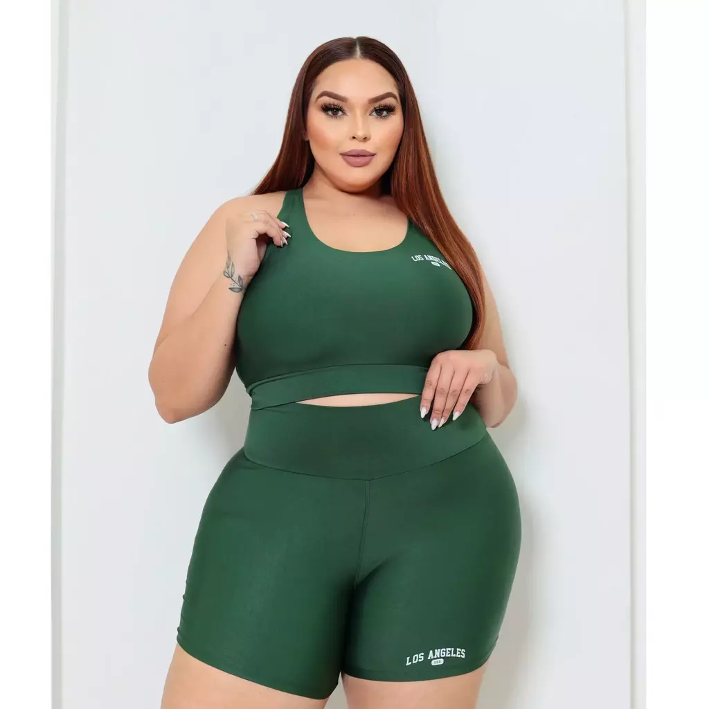 Invista em seu bem-estar com o Kit 3 Conjunto Top e Shorts Plus Size Academia Los Angeles e desfrute de uma experiência fitness com charme e sofisticação.